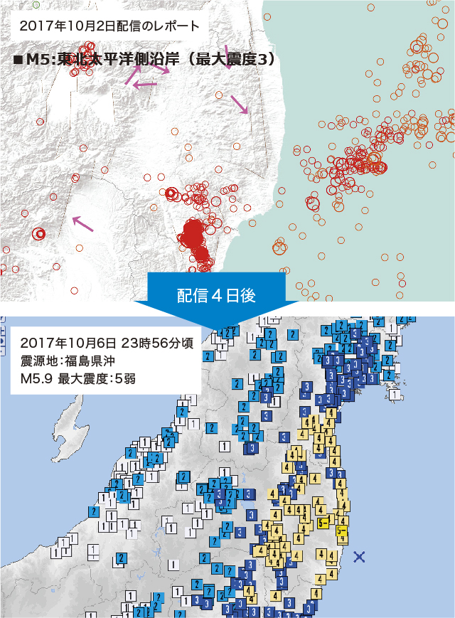 2017年10月2日配信のレポートにおいて、東北地方の複数地点で小規模な地殻変動が観測されていることと、福島県沖で微弱地震が多発していたことから、7日以内に「福島県~茨城県沖」でのM5クラスの地震発生の可能性について記載したところ、配信4日後の10月6日に福島県沖で「M5.9・最大震度5弱」の地震が発生。