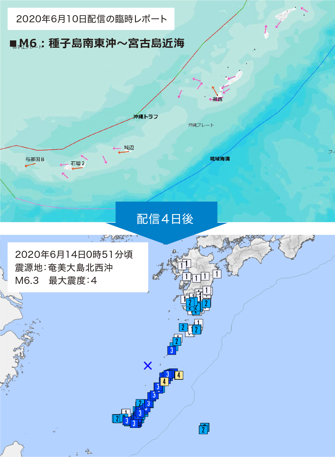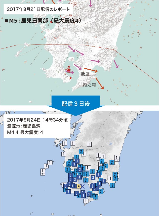 2017年8月21日配信レポートにおいて、鹿児島県南部で「2010年1月25日鹿児島県南方沖・M5.4・最大震度4」発生3日前と同様の南東方向への大規模な地殻変動が観測されたため、3日後に同規模クラスの地震発生の可能性について記載したところ、配信3日後の8月24日に鹿児島湾にて「M4.5・最大震度4」の地震が発生。