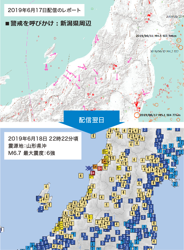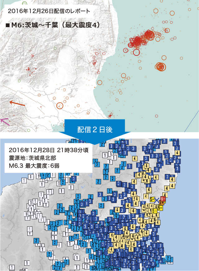 2016年12月26日配信のレポートにおいて、「福島県沖~茨城県沖」にて微弱地震の集中発生が、過去に同エリアで発生したM6クラス地震発生3日前の状況と類似していたため、「茨城県南部~千葉県中央部」にかけて同規模地震発生の可能性について記載したところ、配信2日後の12月28日に茨城県北部にて「M6.3・最大震度6弱」の地震が発生。