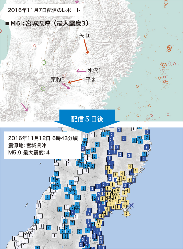 2016年11月7日配信レポートにおいて3週に渡って、東北地方太平洋側で大きな地殻変動が複数地点で観測されていること、及び最新データでは「矢巾・栗駒・大蔵」において牡鹿半島に向かう地殻変動が観測されていることから、7日間以内に牡鹿半島周辺でのM6クラスの地震発生の可能性について記載したところ、配信5日後の11月12日に宮城県沖にて「M5.9・最大震度4」の地震が発生。