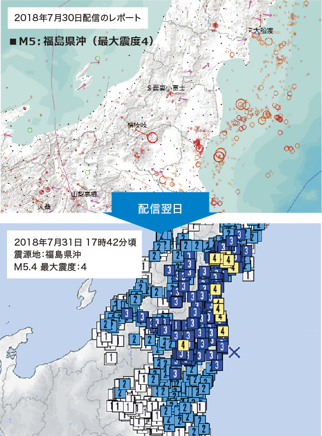 2018年7月30日配信のレポートにて、福島県沖での群発地震の規模が2週間前に比べて拡大傾向にあり、震源の浅い地震発生回数も増加傾向にあることから、M5クラスの地震の発生の可能性について記載したところ、翌7月31日に、福島県沖にてM5.4・最大震度4の地震が発生。