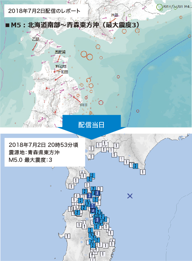 2018年7月2日配信のレポートにて、2週間に渡り大きな地殻変動が継続して観測されているため、M5クラスの地震発生の可能性について記載したところ、配信当日夜に、青森県東方沖にてM5.0・最大震度3の地震が発生。