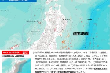 10月18日(月)に配信したレポートにおいて、10月18日から10月26日の期間中に、青森県東方沖~岩手県沖・三陸沖北部でM5~6クラスの地震発生の可能性を記載したところ、10月19日に青森県東方沖でM5.3・最大震度3の地震が発生しました。